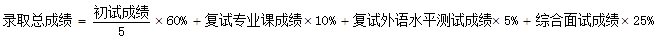三、考生实行差额复试,总成绩中初试成绩与复试成绩将按照以下公式比例进行计算。具体录取总成绩由以下公式进行计算,其中的复试专业课成绩,复试外语水平测试成绩,综合面试成绩都按照百分制计算。