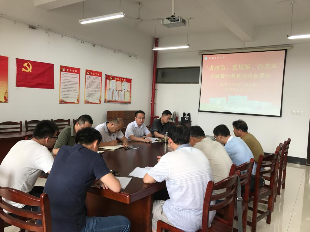 会上还对学院即将出台的《关于在全院党员干部中开展“讲政治、重规矩、作表率”专题警示教育的方案》和《电气学院“讲政治、重规矩、作表率”专题警示教育组织施工图》进行了认真讨论。(撰稿:潘秋红;审核:叶凤华)