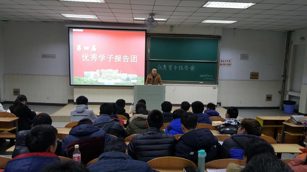 优秀学子报告团成员先进事迹报告会在秀山校区举行。4名同学的成长经历和收获感悟启迪心灵、催人奋进,赢得了电气学院500余名新生的阵阵热烈掌声。