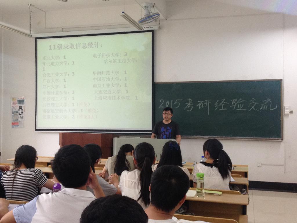 参加5月27号的优秀考取研究生代表学生有中科大的杜圆森、电子科大的黄浩、华北电力大学的李帆。他们几位同学准备了详细的PPT,分别从报考学校、报考专业的选取、制定复习计划、合理安排时间、各门考研科目的复习方法等方面分别介绍了自己考研的经验、感受和体会,获得了同学们热烈的反响。