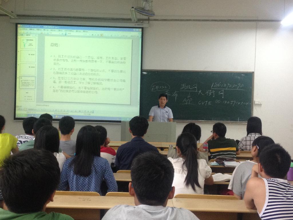 参加5月26号的优秀就业代表学生有左俊、蔡显兵、朱业青、张振。他们对就业的几大核心问题跟同学们进行了梳理和阐述,如,就业中是选择做技术好还是做销售好,薪酬待遇问题,名校歧视问题,面试时应注意的细节,如何在现阶段加强知识积累,如何把握就业黄金时间,遇到了两份好工作如何选择等问题。各位代表也对同学们的提问进行了详细、耐心地讲解,帮助他们排除心理上关于就业的种种疑虑。
