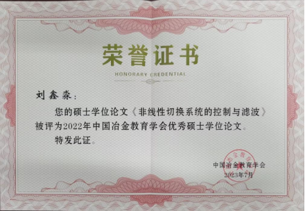 电气工程专业刘鑫淼的硕士学位论文《非线性切换系统的控制与滤波》成功入选,论文指导教师为学院沈浩教授。据悉,2022年中国冶金教育学会优秀博(硕)学位论文共评出优秀博士学位论文25篇,优秀硕士学位论文100篇。