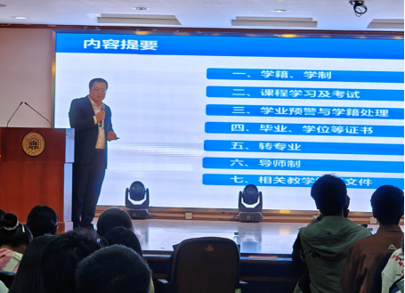 程木田聚焦学业学籍管理要点,为新生详细解读了校规校纪、学籍学制、学业预警与学籍处理、第二课堂与课外学习、毕业资格与学位资格、学生奖励等方面的相关政策和制度,并向全体新生提出三点建议:一是要做好大学规划,树立远大目标。二是要端正学习态度,夯实专业基础。三是要积极实践锻炼,提升综合素质。科学合理地做好学业和职业规划,顺利完成学业。