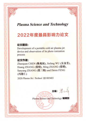 三名教师参加了会议,其中,陈兆权教授受邀作了题为“大微波瑞利散射测定等离子体射流的电子密度及其时空演化”的邀请报告,引起了与会专家和学者的热烈讨论与积极反响。陈思乐老师作了题为“大气压微波碳氟等离子体源研制”的口头报告。会议期间,与会教师们与等离子体物理学相关领域的专家们积极交流、深入探讨、受益匪浅。闭幕式上,《Plasma Science and Technolgy》期刊颁发了“2022年度最具影响力论文”奖,陈兆权教授的论文“Development of a portable cold air plasma jet device and observation of its photo ionization process”荣获此奖项。