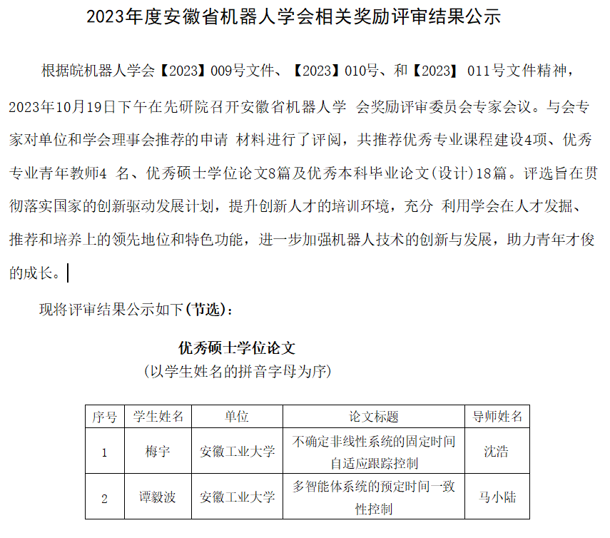 两篇硕士学位论文在众多作品中脱颖而出。沈浩教授指导的硕士生梅宇撰写的《不确定非线性系统的固定时间自适应跟踪控制》的论文,马小陆教授指导的硕士生谭毅波撰写的《多智能体系统的预定时间一致性控制》论文,成功入选为2023年度安徽省机器人学会优秀硕士学位论文奖。根据公示结果,2023年度安徽省机器人学会共推荐优秀专业课程建设4项、优秀专业青年教师4名、优秀硕士学位论文8篇及优秀本科毕业论文(设计)18篇。