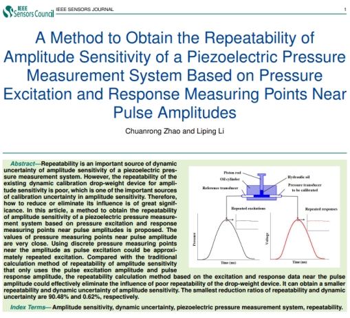 赵传荣博士和南京晓庄学院李丽萍博士合作,在传感器领域国际TOP期刊《IEEESENSORS JOURNAL》(中国科学院2区,TOP期刊,2022年影响因子:4.3)发表了题为“A Method to Obtain the Repeatability of Amplitude Sensitivity of A Piezoelectric Pressure Measurement System based on Pressure Excitation and Response Measuring Points Near Pulse Amplitudes”的学术研究论文,赵传荣为该文的第一作者和通讯作者。