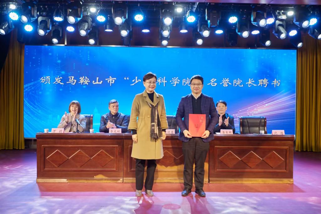 “少年科学院”揭牌仪式后,史达蓉为沈浩教授颁发马鞍山市“少年科学院”名誉院长聘书。沈浩表示将通过开展科技培训、科技普及、科技实践、科技竞赛等活动,为广大青少年参与科技创新搭建更广阔的舞台;希望少年科学院成为青少年朋友们启迪智慧、创新实践的沃土,为深入推进创新型城市建设,为马鞍山高质量发展注入强劲动能。