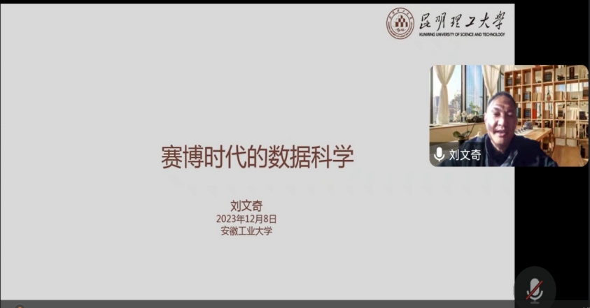 12月8日上午,昆明理工大学数据科学与大数据技术国家“双万计划”一流本科专业建设点负责人刘文奇教授受邀在线上进行学术报告和学术交流。此次报告主题为:赛博时代的数据科学,报告由学院院长沈浩教授主持,副院长程木田及近百名教师和研究生参加。