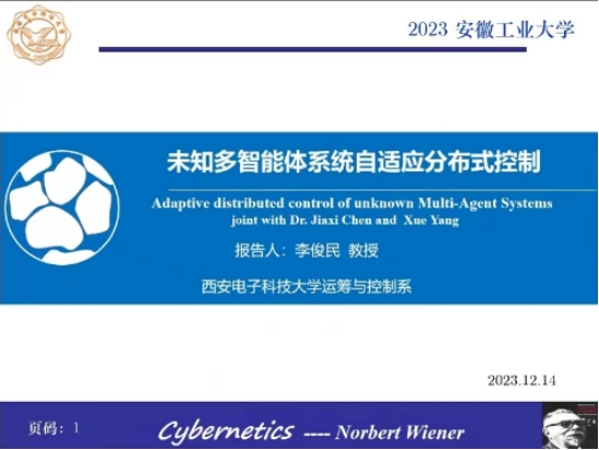 李俊民教授首先以控制论的起源和发展给大家做了生动有趣的开场,介绍了控制论的创始人美国数学家维纳教授的生平及学术研究成果;详细介绍了多智能体系统的不精确通信拓扑结构,提出一种模糊联合连通的概念,对一类不精确通信拓扑的多智能体设计分布式一致性控制协议,给出其达到渐近一致性的条件。会上,李俊民教授与PG娱乐城