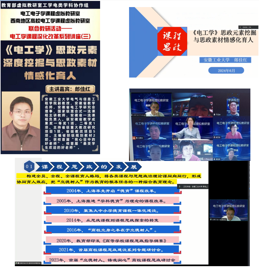为了加强高校课程建设质量,推进高校间先进教学理念的交流研讨,提升高校工学电类学科课程的教育教学水平,服务人才培养质量提升。6月13日,教育部虚拟教研室工学电类学科协作组——“电工电子学课程虚拟教研室与西南地区高校电工学课程虚拟教研室”联合教研活动之电工学课程深化改革系列讲座(三)在线上会议开展,来自重庆大学、天津大学、中国矿业大学、合肥工业大学等20多所高校教师参加教研活动,安徽省教学名师、PG娱乐城