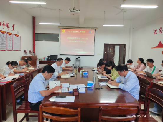 9月24日上午,学院党委理论学习中心组在电气楼304室开展政治理论第十次集体学习,学院党政领导、党委委员、党支部书记、科级干部和全体辅导员等参加,学院党委书记丁忠利主持。