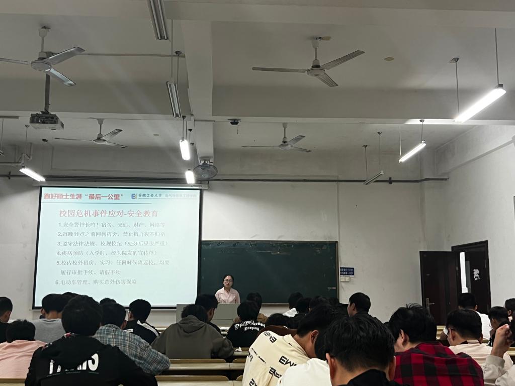 针对三个年级以及延期毕业的研究生,在电气楼、QQ群分年级、分批次开展安全教育大会、安全座谈会、学生干部培训会,会议由学院研究生辅导员张敏主讲。