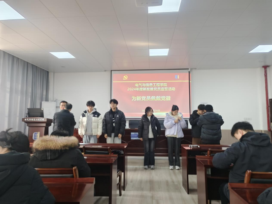 会上,李克明宣读了学院党委关于党员发展和转正的批复,并向新党员们表示祝贺,要求全体党员在今后的专业学习、社会实践和创新创业等各项工作中牢记党员身份,切实履行党员职责,勇当先锋充分发挥模范带头作用。丁忠利、李克明向新加入党组织的党员同志们佩戴党员党徽。宣誓环节上,全体新老党员起立,面向鲜红的党旗,在领誓人带领下,举起右拳,庄严宣誓,宣誓声铿锵有力,展现同志们坚定的理想信念和为党的事业奋斗终生的坚定决心。在专题党课环节上,丁忠利围绕党的二十届三中全会的丰富内容和重大意义等方面,分别从党的改革开放历程、全面深化改革的重大意义、三中全会报告的丰富内涵、大学生贯彻落实全会精神的具体实践路径等方面作了阐述与讲解;同学们听后纷纷表示对全会精神有了更深入的理解和把握,对未来大学里的努力方向有了更强劲的动力,在今后的专业学习、社会实践、班级管理、同学帮扶等方面将持续努力,以更加坚定的信念、更加务实的作风、更加有为的成绩,展示新时代学生党员的新作为和新形象。