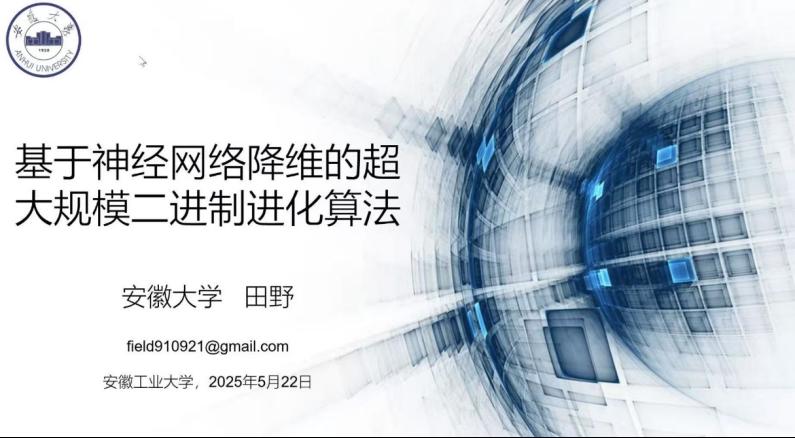 5月22日,应学院邀请,安徽大学田野教授以线上方式为学院师生作题为“基于神经网络降维的超大规模二进制进化算法”的学术报告。报告旨在深入探讨利用神经网络进行降维的超大规模二进制优化算法的理论基础与应用前沿,讲座吸引了学院众多教师与研究生的积极参与,学院副院长李飞主持本次活动。