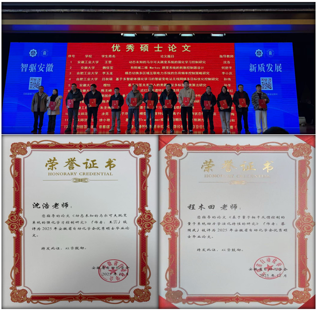 喜获安徽省自动化学会优秀硕士毕业论文奖、优秀本科毕业论文奖以及优秀青年人才奖。其中,硕士研究生王雲撰写的《动态未知的马尔科夫跳变系统的强化学习控制研究》(指导教师:沈浩)和蔡国庆撰写的《基于量子相干反馈控制的量子系统动力学演化特性的研究》(指导教师:程木田)获得优秀硕士毕业论文奖;本科生王文泽撰写的《基于代理模型的激波风洞膜片选型方法研究》(指导教师:费习宏)和孙泽林撰写的《基于光纤光栅的动态数字手势智能识别研究》(指导教师:钱牧云)获得优秀本科毕业论文奖;PG娱乐城
