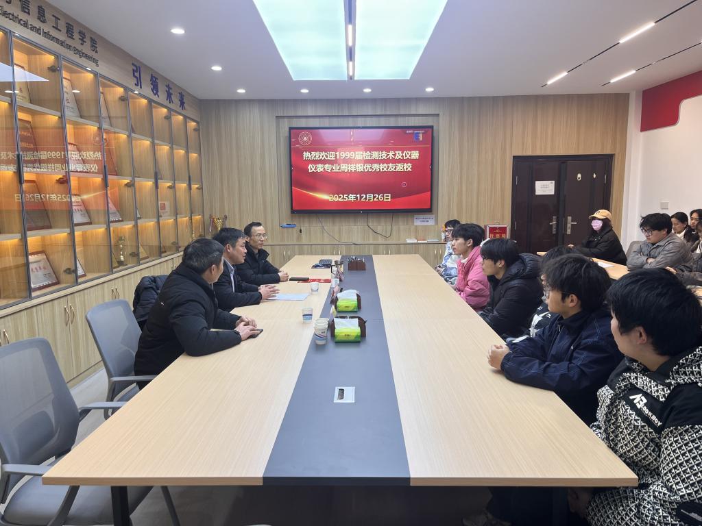 12月26日下午,北京弥天科技有限公司总经理、1995级检测技术及仪器仪表专业的优秀校友周祥银回到母校,在参加学校一年一度学生表彰大会优秀校友发言后,他来到学院,参加毓秀讲坛“优秀校友面对面”活动,与师生座谈交流。学院党委书记丁忠利,党委副书记、纪委书记、副院长孔洋波和24级测控专业学生共同参加。