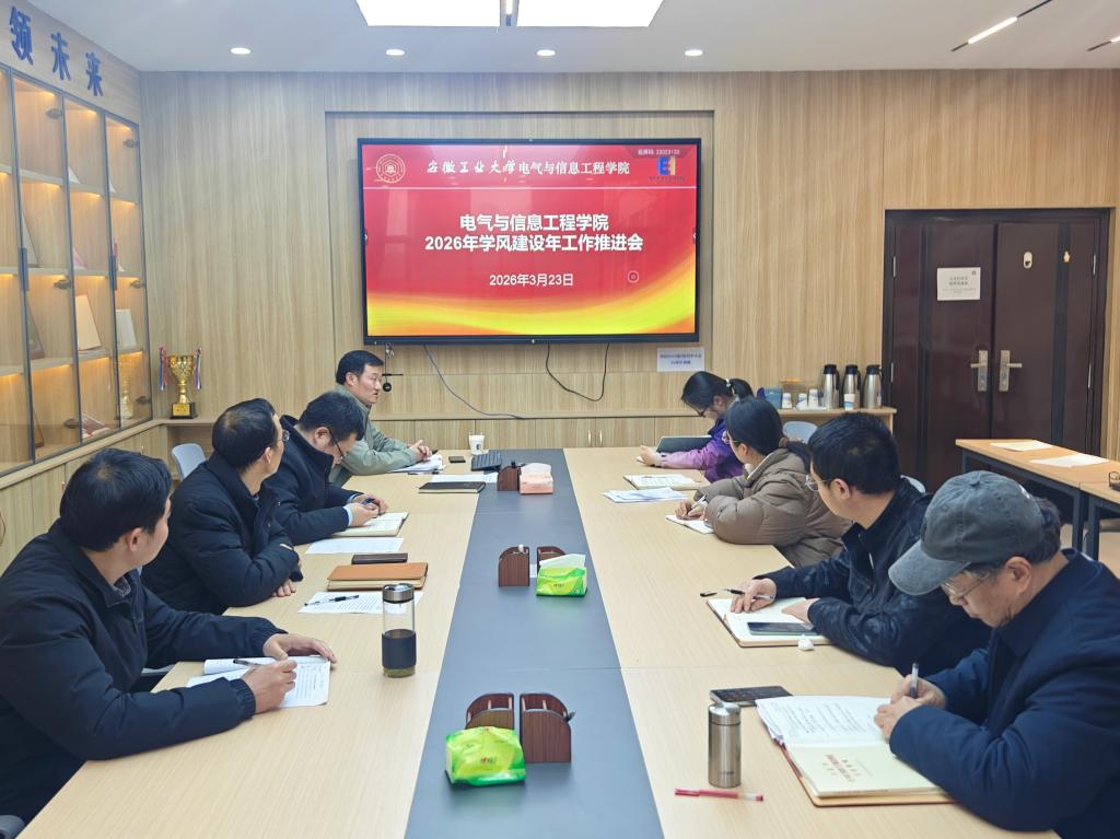 在电气楼308会议室召开2026年学风建设年工作推进会。会议由学院党委副书记、纪委书记、副院长孔洋波主持,学院党委书记丁忠利、院长程木田、副院长张前进出席,各系室主任、支部书记、全体辅导员参会。