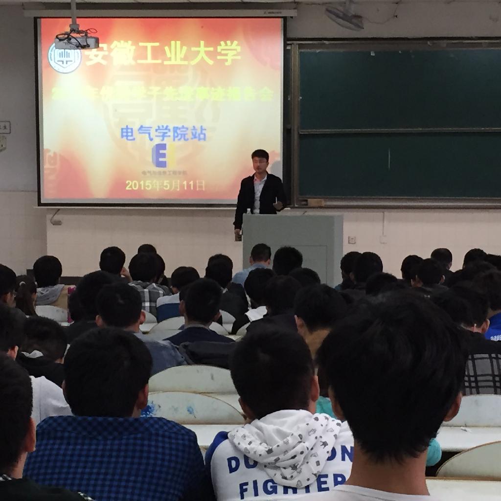 为营造良好的学习氛围,调动大学生学习的热情和积极性,安徽工业大学2015年优秀学子报告会于5月11日下午在阶教102教室顺利举行并圆满结束。学工部副部长胡卫东、电气学院党委副书记、副院长郭宏、团委书记张满堂、辅导员李修正及全体大一学生参加本次报告会,胡卫东主持了本次会议。