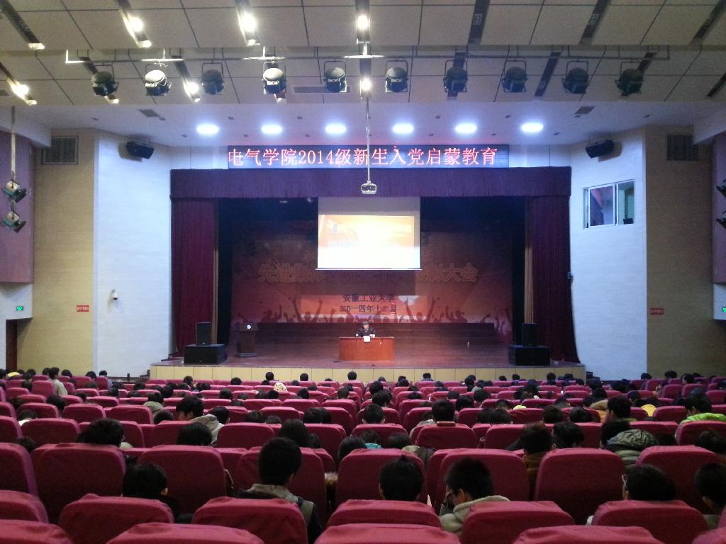 于2014年12月8日晚上在大学生活动中心开展新生入党启蒙教育,活动由关工委陈贵棠副主任主讲,学院党委副书记、副院长郭宏、学院辅导员张满堂、孔洋波和2014级全体新生听取了讲座。