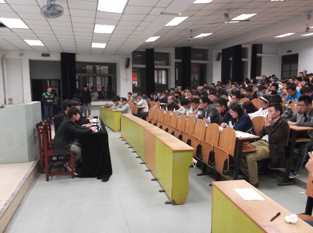 在阶教201举办2013-2014年度“校先进班级”评选答辩会,学院党委副书记、副院长郭宏出席,全体辅导员和部分班主任参加,答辩班级全体同学参与,全院班长和团支书现场观摩。