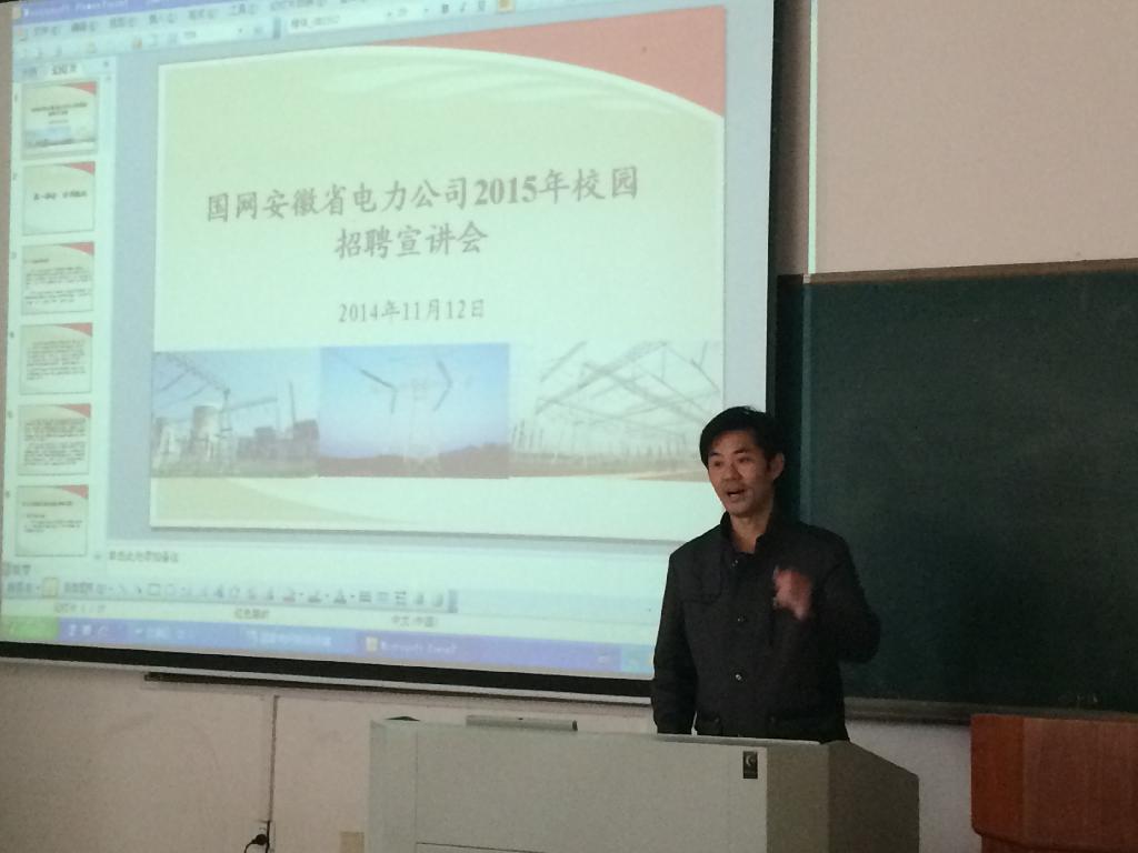 11月12日下午,马鞍山市供电公司在电气楼114室开展2015校园招聘宣讲。宣讲会由马鞍山市供电公司人力资源部主管戴德清主讲。PG娱乐城