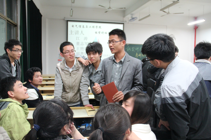 本次讲坛为招标课题,开讲之前一周,尚老师已提前联系了部分考研成功的学长和学姐,确定了电气专业江涛、董志军、王艳秋,电子专业胡奥亭,通信专业邵万心等五位主讲人,邀请他们为同专业的学弟学妹们进行专业学习和考研交流。