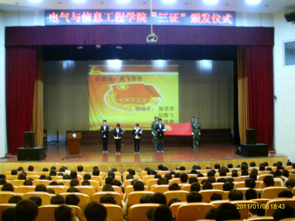 在大学生活动中心举行了2013级新生“三证”颁发仪式,仪式由院团委书记张满堂主持,院党委副书记、副院长郭宏、各年级辅导员、学院团委学生会干部以及2013级全体新生团员参加了仪式。