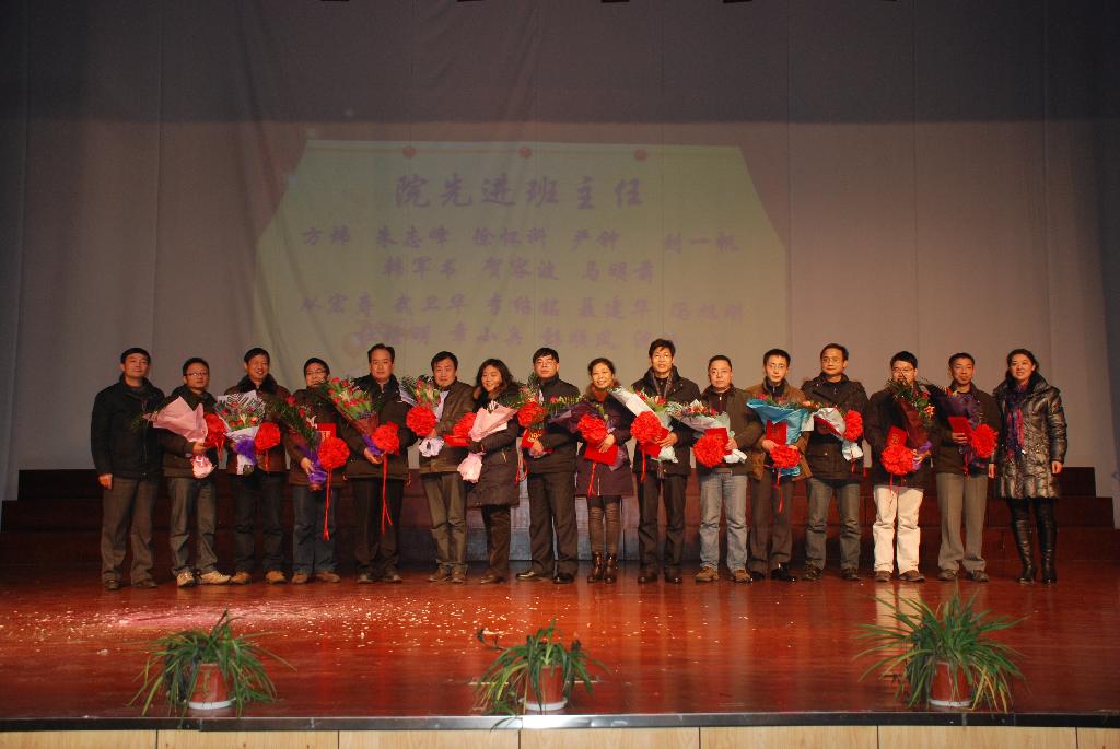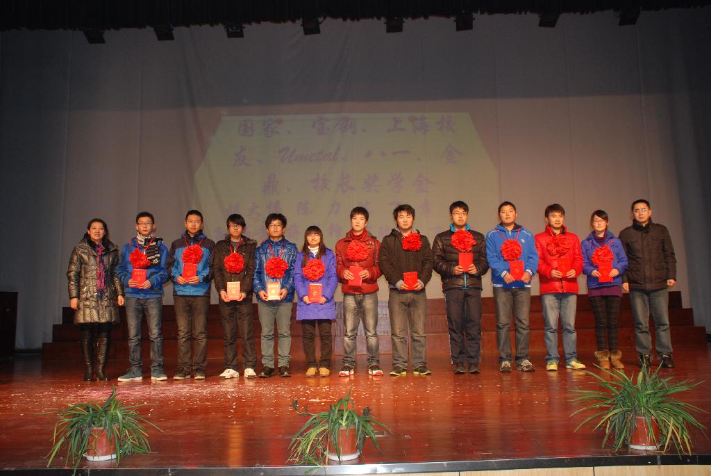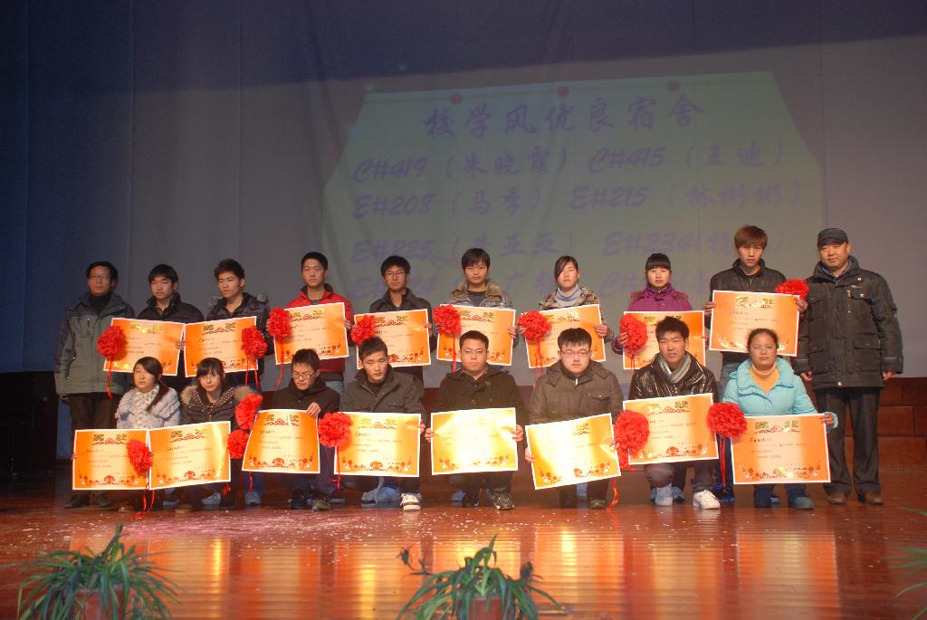 在颁奖仪式上,姚敏部长向获奖同学们表示了祝贺,并为先进集体和先进个人颁发了证书,为院先进班主任、国家奖学金、宝钢奖学金、校长奖学金、国家励志奖学金获得者佩戴了光荣花