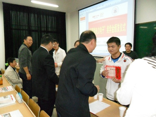 11月5日上午 事特-安徽工业大学2011年电力电子奖学金颁奖典礼在东校区电气楼113教室隆重举行,易事特电源股份有限公司董事长何思模先生,电气信息学院党委书记孙世民、院长赵光兴、副院长张捍东、姚敏出席了颁奖典礼,2010-2011年获得该项奖学金的同学及志于创新创造的电气学子参加了本次颁奖典礼。典礼由姚敏副院长主持。