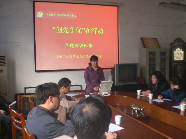 4月14日下午,电气信息学院举行了“创先争优”主题演讲比赛。学校创先争优活动领导小组办公室主任季中秀、学院党政领导、各基层支部书记、部分党员教师观看了演讲比赛。学院党委副书记姚敏主持了比赛。
