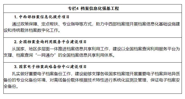 ——档案信息化建设再上新台阶。档案信息化发展保障机制进一步完善,档案信息化建设进一步融入数字中国建设,新一代信息技术在档案工作中的应用更为广泛,信息化与档案事业各项工作深度融合,档案管理数字化、智能化水平得到提升,档案工作基本实现数字转型。