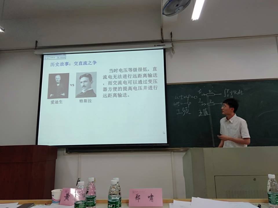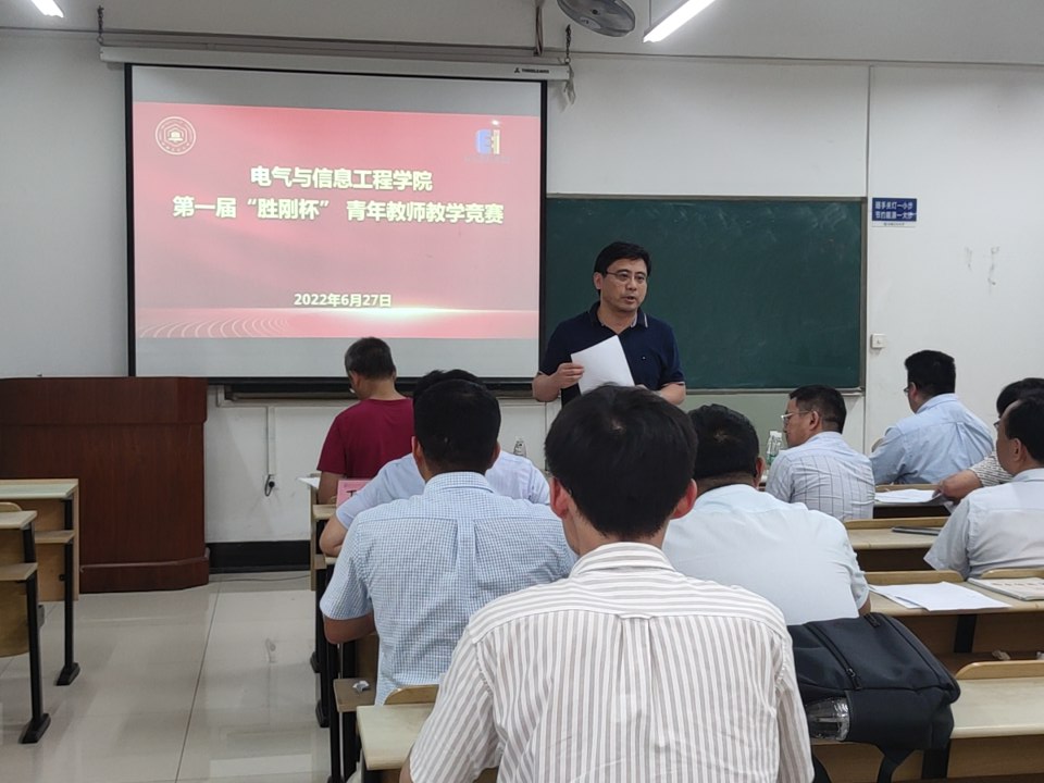 首届“胜刚杯”青年教师教学竞赛在电气楼504举行。本次比赛特别邀请了教务处处长郑啸教授、创新教育学院院长黄志甲教授、马克思主义学院院长高敏教授以及学院教学督导组成员从宏寿、郎佳红老师担任评委,来自电气工程等系室7名青年教师参加了比赛,院长王兵致辞,副院长程木田教授主持。