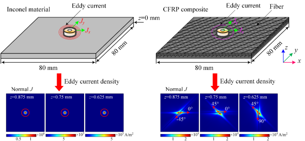本研究根据CFRP材料自身的电学特性和分层损伤特征,提出采用常规涡流检测(Eddy current testing, ECT)技术对三种典型CFRP铺层结构的分层损伤进行识别。研究结果表明:CFRP正交板和多向板各层间界面具有优异的涡流积聚能力,显著提高了分层损伤检测灵敏度。由于CFRP单向板各铺层方向一致,使得各层间界面不具备聚积涡流的能力,导致单向板分层损伤涡流检测的灵敏度极低,几乎无法识别。本研究为进一步完整表征CFRP分层损伤特征奠定了理论基础,同时能够拓展涡流无损检测技术在先进复合材料领域的应用,在理论层面和工程应用层面均具有重要的意义。