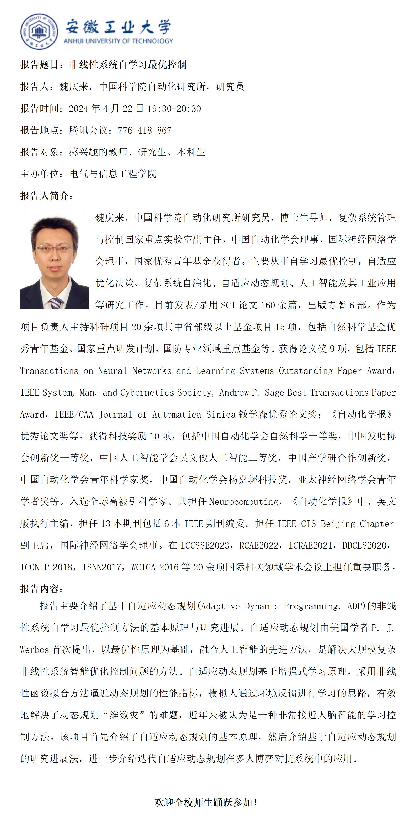 “谦之”学术讲坛之八十一-非线性系统自学习最优控制