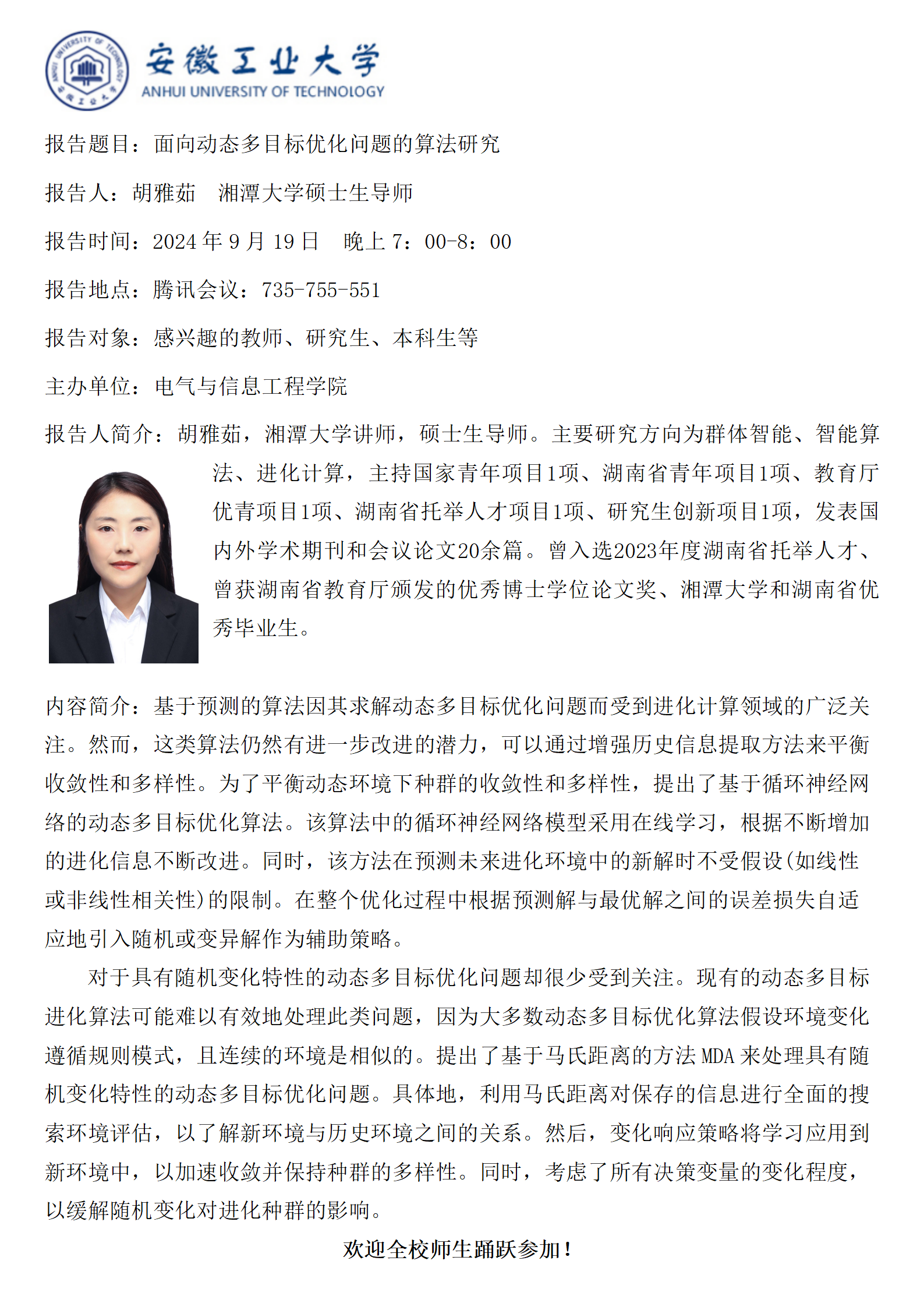 砺山学术报告之三十九-面向动态多目标优化问题的算法研究