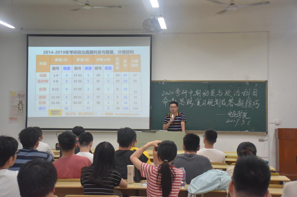 邀请南京旅游职业学院思政部教师尚全老师作为主讲人,在电气楼113教室举办“2020年考研中期动员与政治科目命题思路、复习规划及答题技巧”专题讲座,2016级考研学子聆听了本次讲座。