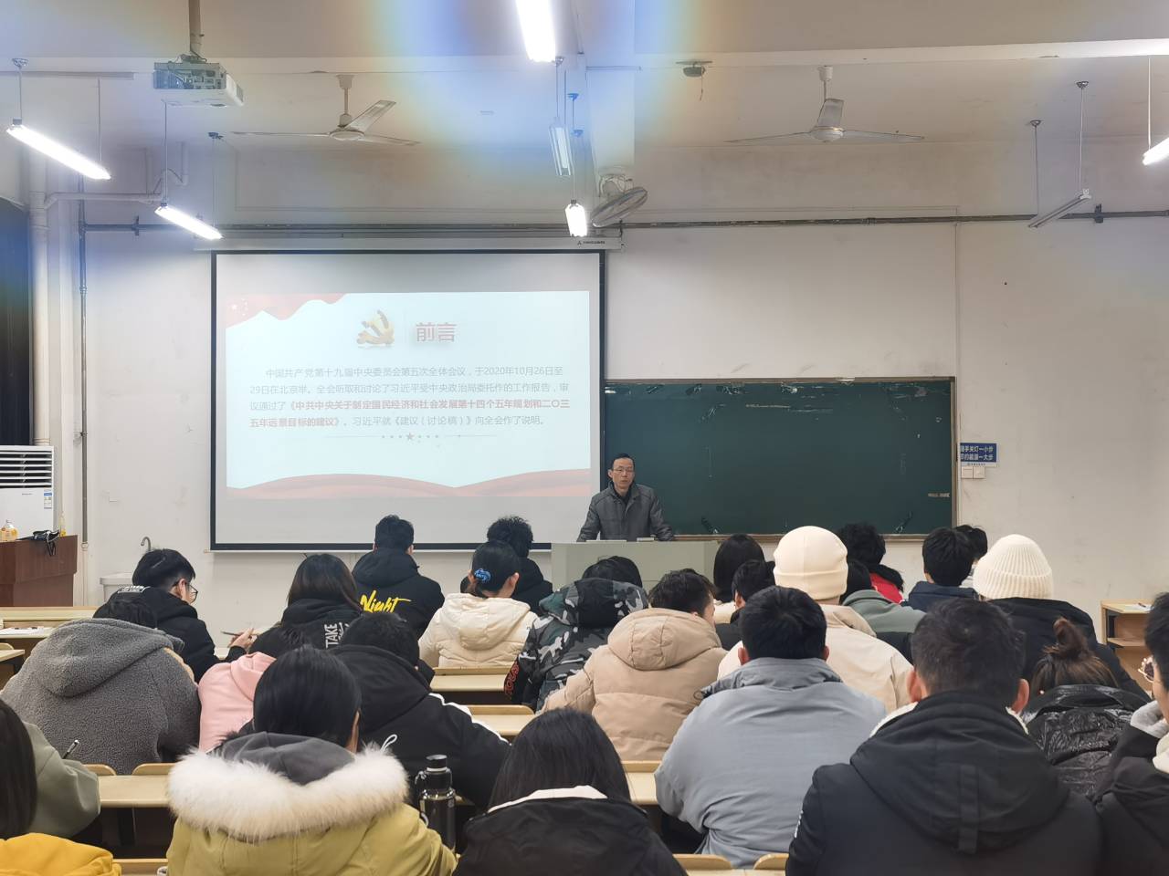 为深入学习贯彻党的十九届五中全会精神,1月9日下午,电气学院党委书记丁忠利在电气楼112,以《党的十九届五中全会精神解读》为题,为学院2021年3月份发展对象班学员上了一堂深刻生动的党课。