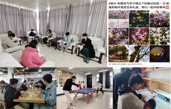 学院以疫情为教材,以校园抗疫战场为育人课堂,强化教师主导性和学生主体性作用,创新打造“师生成长共同体”。组织“好书共读”:师生互相推荐专业相关、疫情相关的经典书籍,通过“日日读、细细品、深深悟”的共读时间来认识世界、读懂中国、启迪智慧、润泽心灵,注重引导学生思考在全民战“疫”中如何发挥供电保电、智能感知、无线通讯等专业知识的力量;推进“美食共享”:启动辅导员与学生面对面的约饭畅谈节奏,聊网课学习的效果与问题,讲班级建设的方法与路径,谈个人的职业规划与人生梦想……畅谈之余,辅导员晒出与同学们每日三餐的各种美食图片,提倡自觉增强防疫意识,不点外卖不网购,远离垃圾食品,相约在食堂遇见更香的饭菜、遇见更好的自己;落实“身心共健”:辅导员与学生互勉疫情期间要加强体质锻炼,开展球类、跑步等运动,田径场的跑道上、球拍的击球声里,师生同台竞技,尽显青春活力。同时,辅导员利用新媒体平台坚持推送疫情防护科普知识,并组织学生以宿舍为单位在保证规律作息的基础上开展书法、绘画等形式多样的文艺活动,既缓解心理压力,又挖掘学生特长;倡导“春景共赏”:驻校教师带领学生漫步校园,欣赏春日校园美丽风光,讲解学校和学院建设发展历程,感受厚重的历史文化底蕴,增强战胜疫情、守护校园的信心和决心。