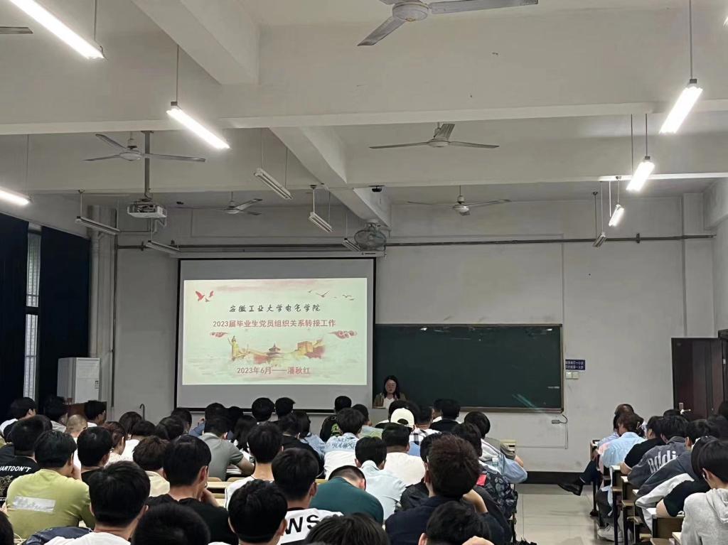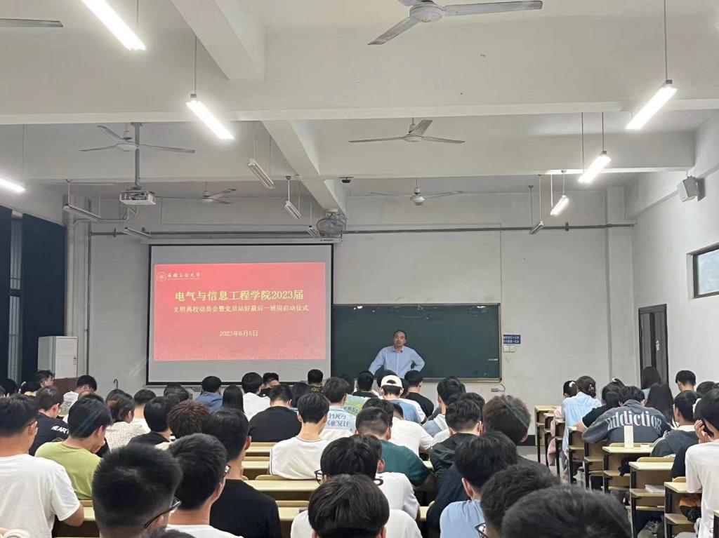 于6月5日在电气楼112教室召开2023届毕业生文明离校动员暨党员站好最后一班岗启动仪式。学院党委副书记、副院长夏玉钦,党委秘书潘秋红,各支部书记,年级辅导员和全体2023届毕业生党员参加了此次动员会。会议由张敏主持。