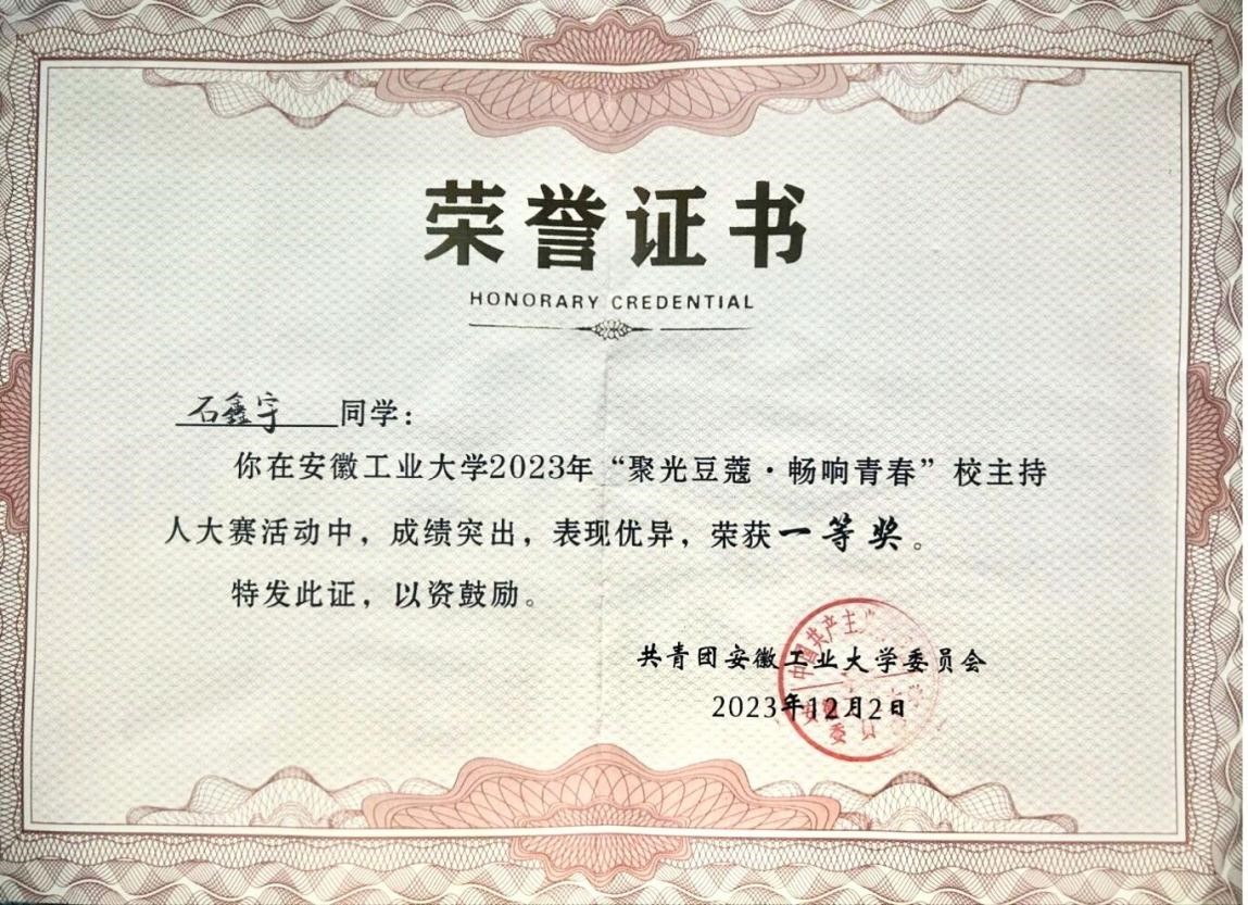 通232班石鑫宇同学在此次大赛中荣获一等奖。