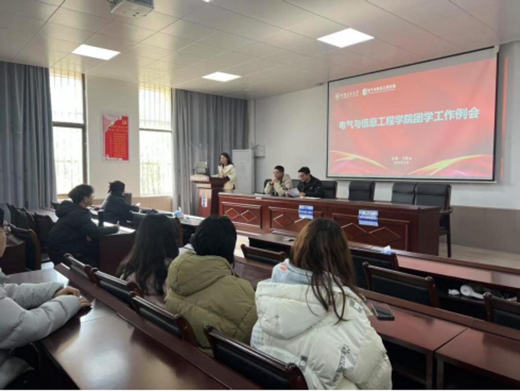 在秀山校区电气楼113室召开新学期首次团委学生会工作例会。院团委书记甘如美江、院团委副书记杨恒基、2023级辅导员蒋安东出席会议,院学生会主席团成员及各部门负责人共20余人参加会议。