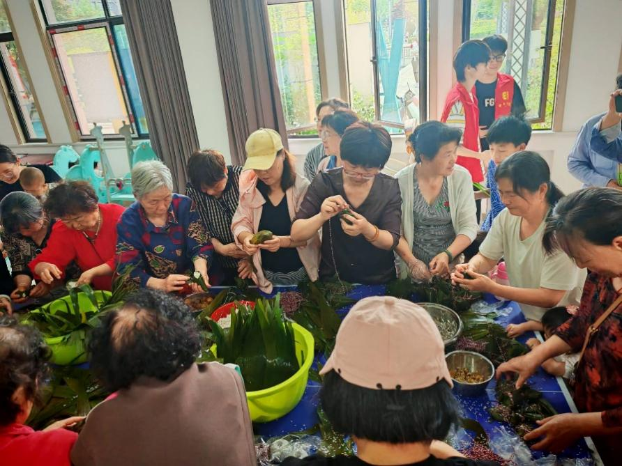 图为家长们围聚动手包粽子