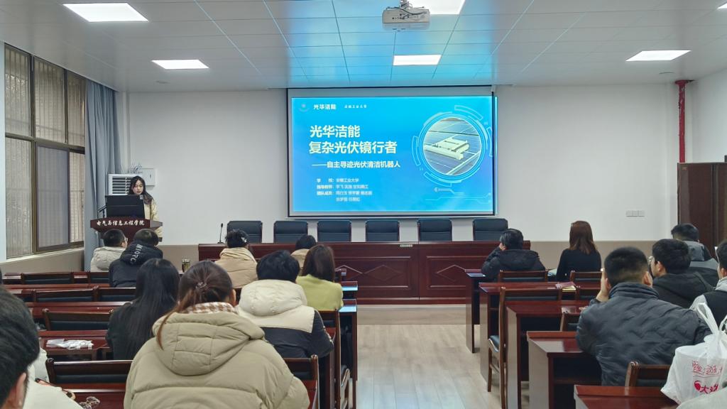“复杂光伏境行者—自主寻迹光伏清洁机器人”等七个项目获悉晋级第2024年安徽工业大学“挑战杯”中国大学生创业计划竞赛。3月4日下午,学院团委在电气楼113报告厅开展入围“挑战杯”校赛项目第一次模拟答辩,现场部署团队备赛内容,院党委副书记、副院长李克明、副院长李飞、团队指导老师、项目团队全体成员参加了会议,此次会议由院团委甘如美江主持。