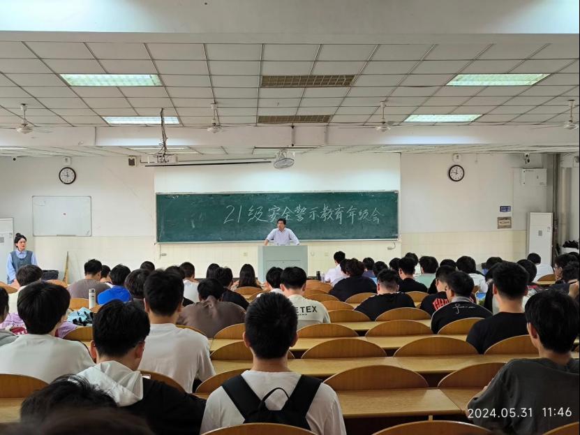 于5月31日中午在东阶103、104召开2021级安全警示教育年级会。会议由学院党委副书记、纪委书记、副院长李克明主持,年级辅导员从婉露、温健竹和21级全体学生参会。