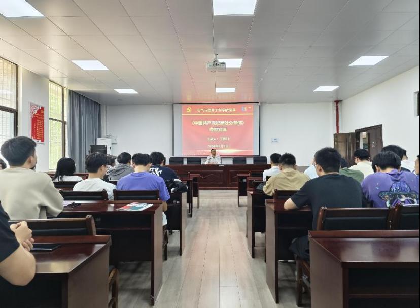 学生电气工程党支部在电气楼113教室开展党纪学习教育专题党课。学院党委书记丁忠利主讲,支部全体党员参加,支部副书记蒋安东主持。