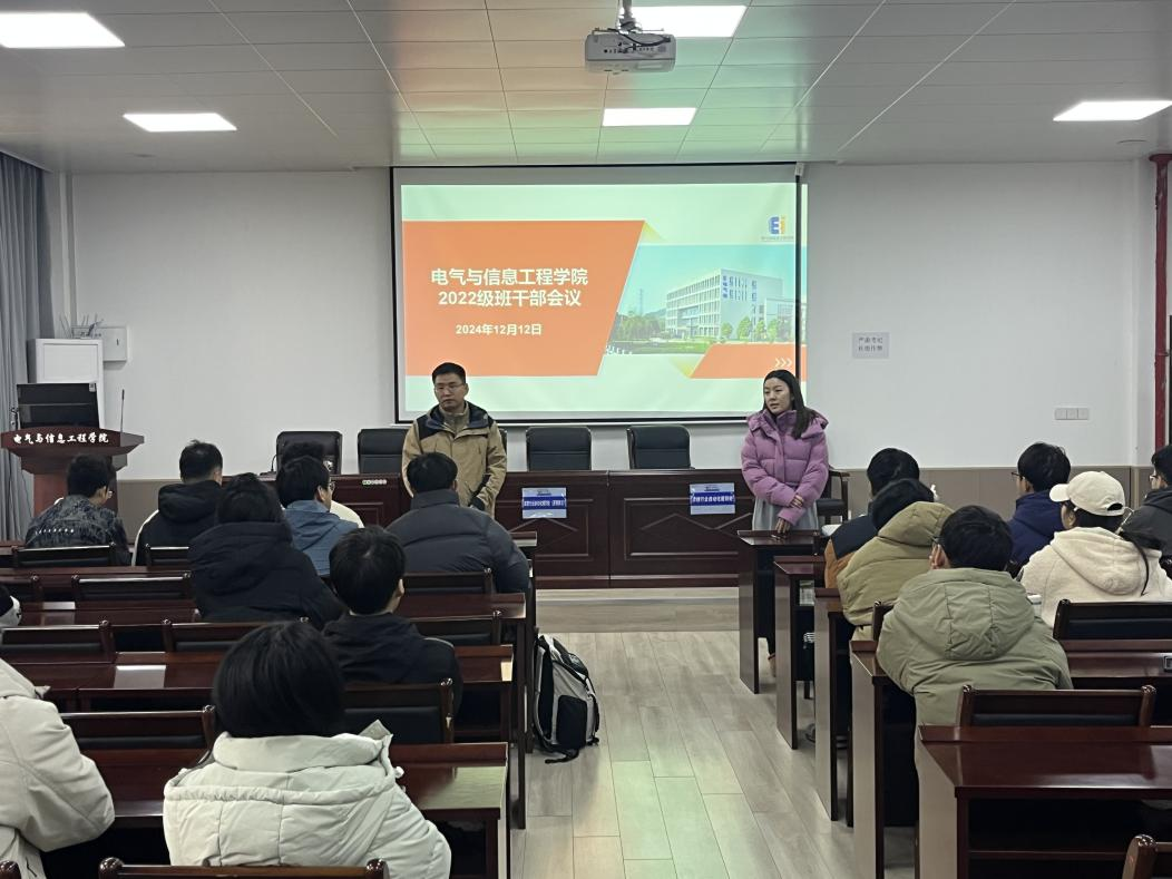 在电气楼113召开2022级主要学生干部会议,会议由2022级辅导员李修正、甘如美江、杨恒基主持,2022级各班主要学生干部参加。